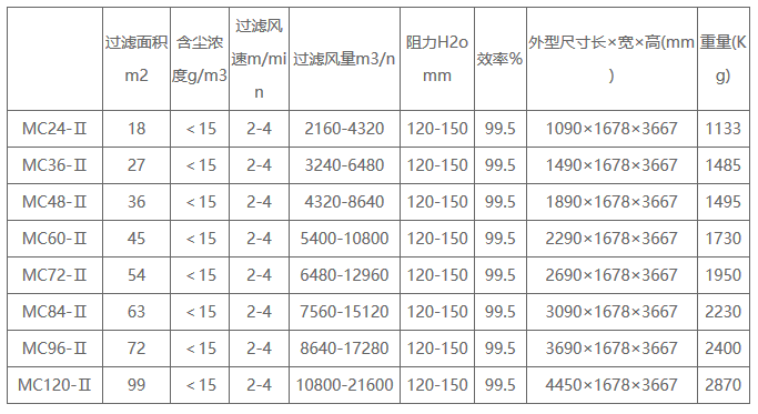 MC脉冲除尘器性能参数: